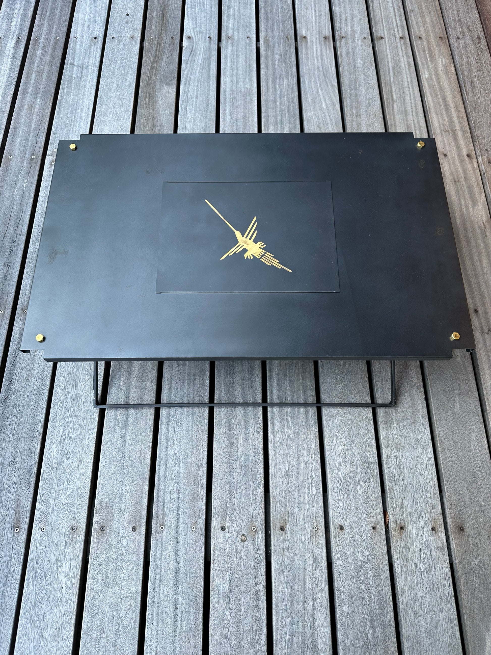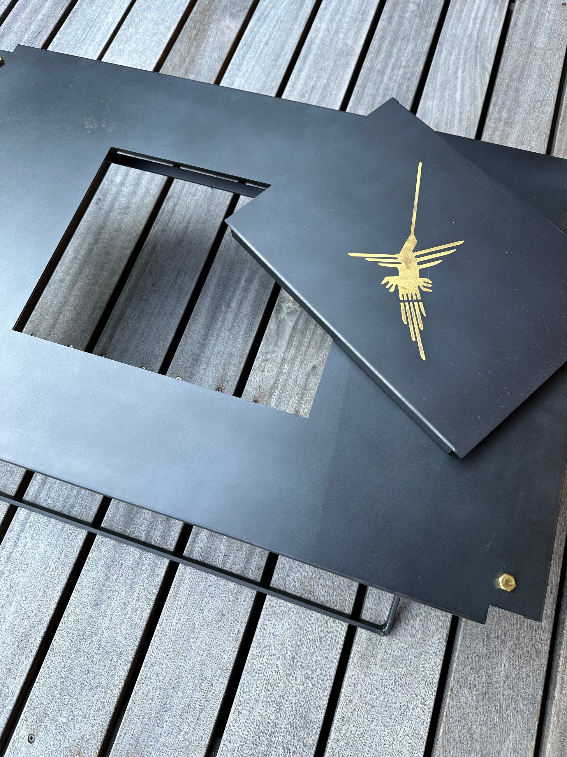 センターテーブルは中央部にフラットバーナーなど市販のバーナー類をセットできるローテーブル。通常は中央部に飾り天板をつけたまま使用します。外した中央部の天板は別売りのスタンド(25300円web掲載なし・お問合せください)を使ってサイドテーブルとして利用できる。写真の収納用麻袋が付属致します。