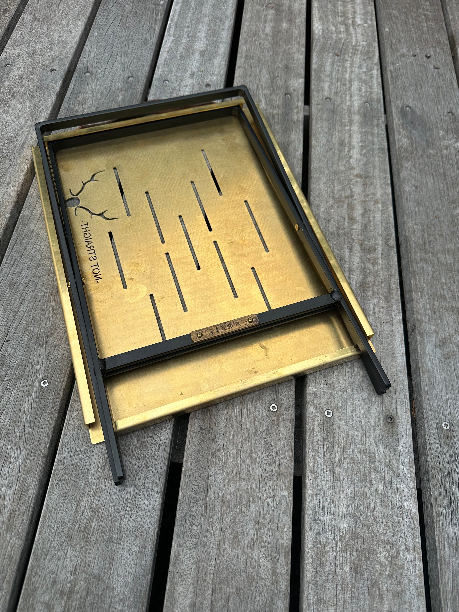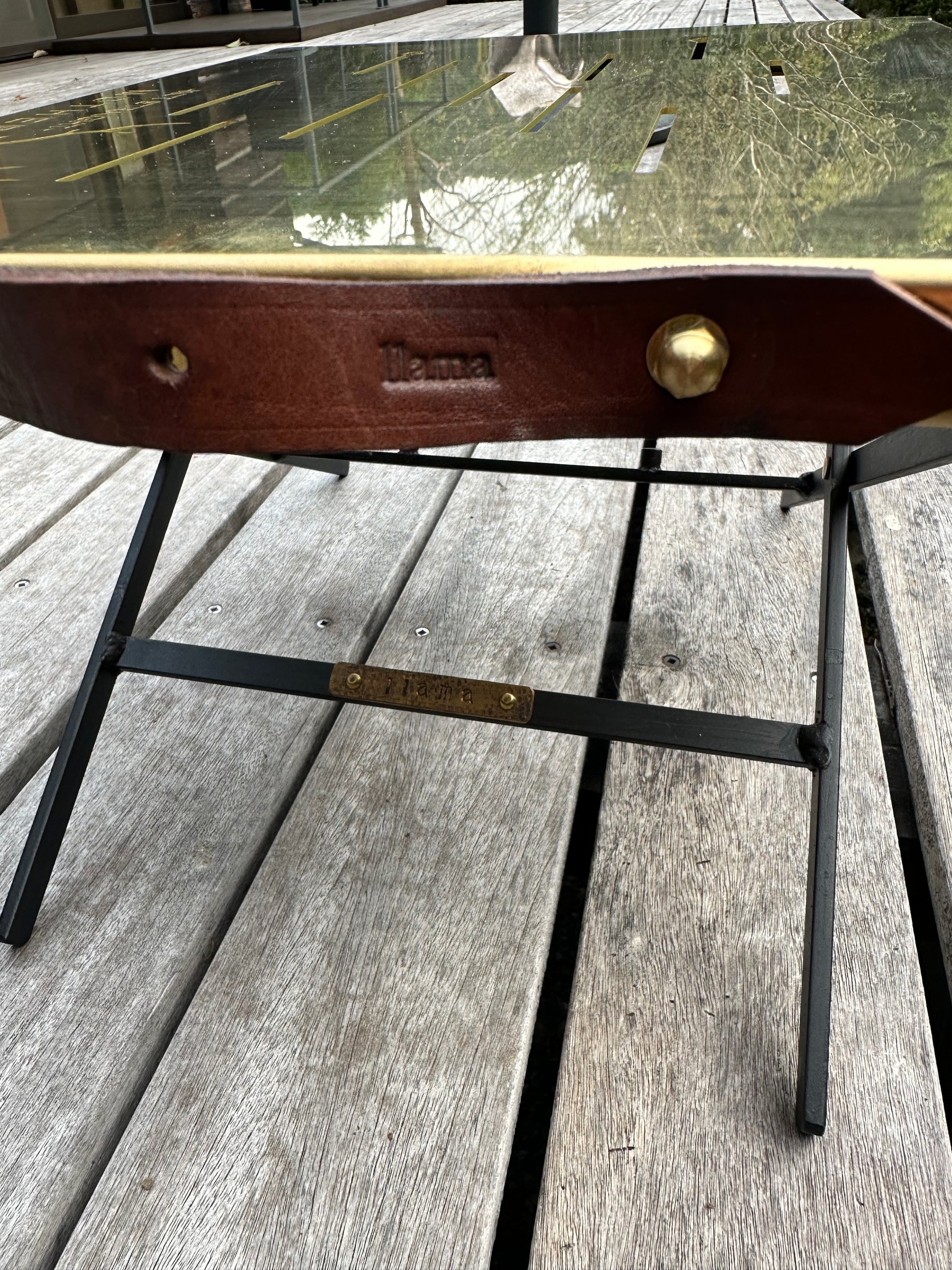 二本の真鍮ビスを外し、天板裏に固定するだけで折りたためる。