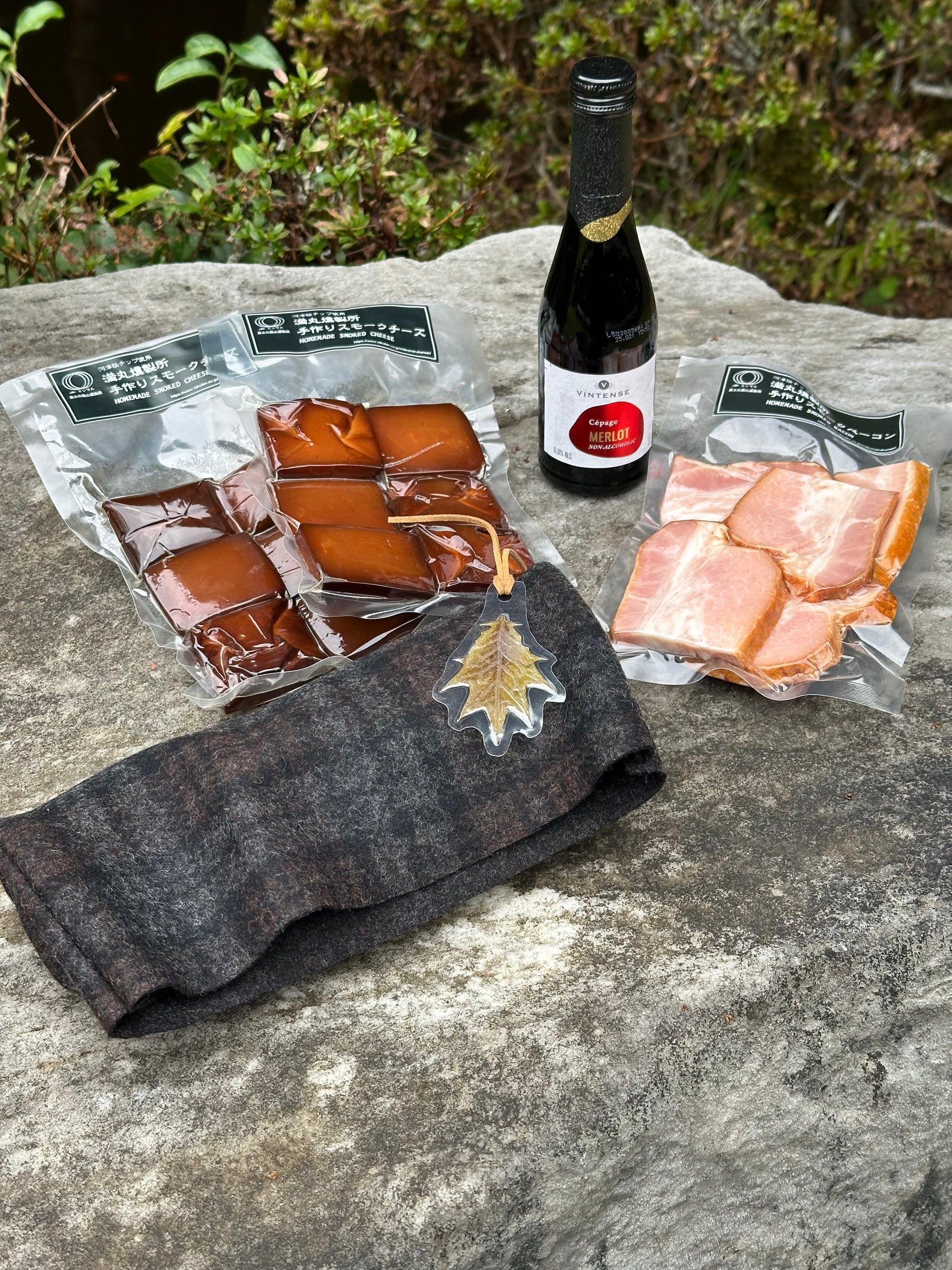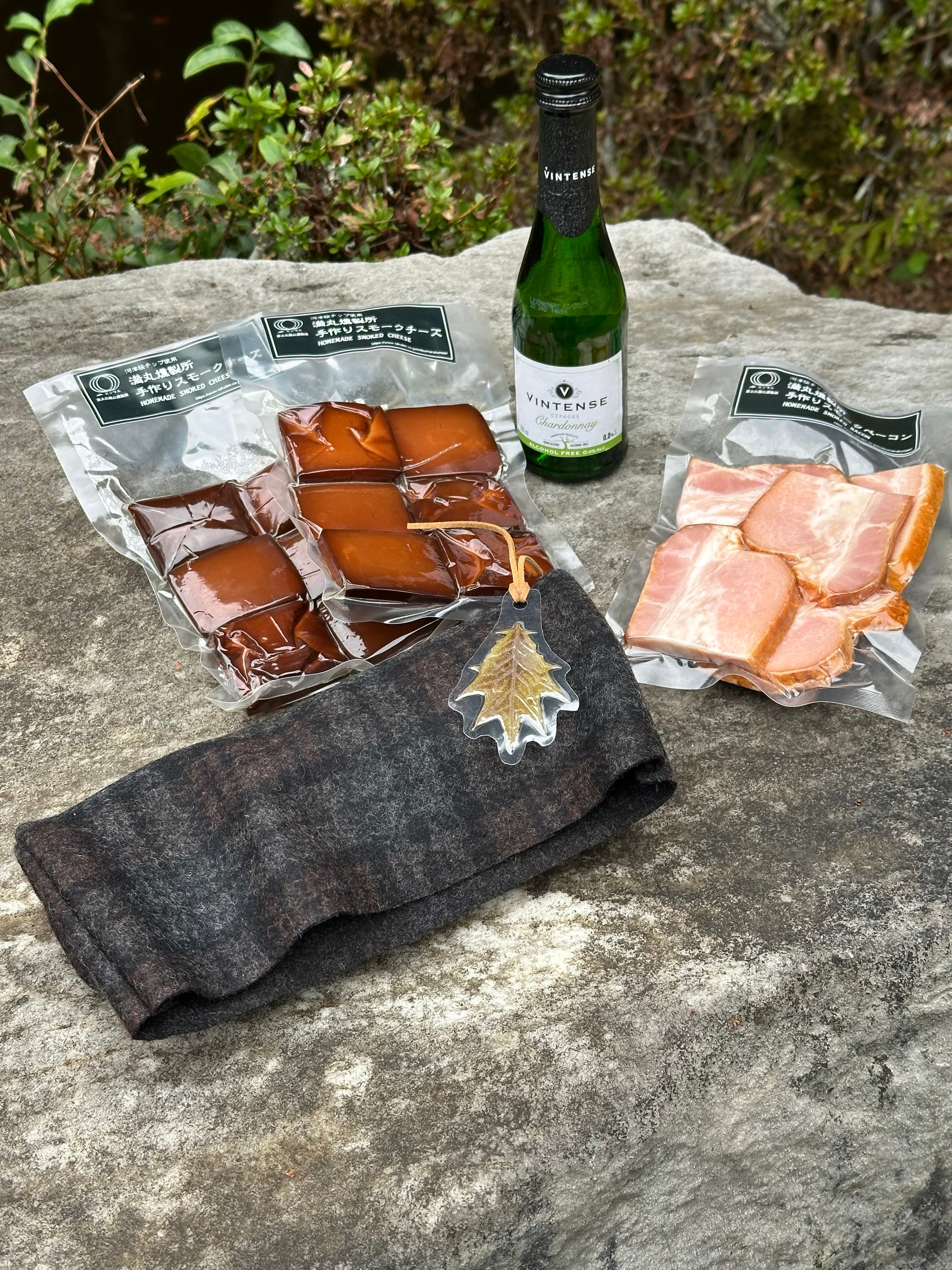 「ただ一つの、ゆっくりした夜のためのセット」ノンアルコールワイン+自家製スモークチーズのはじ+スモークベーコン。手仕事袋入り。